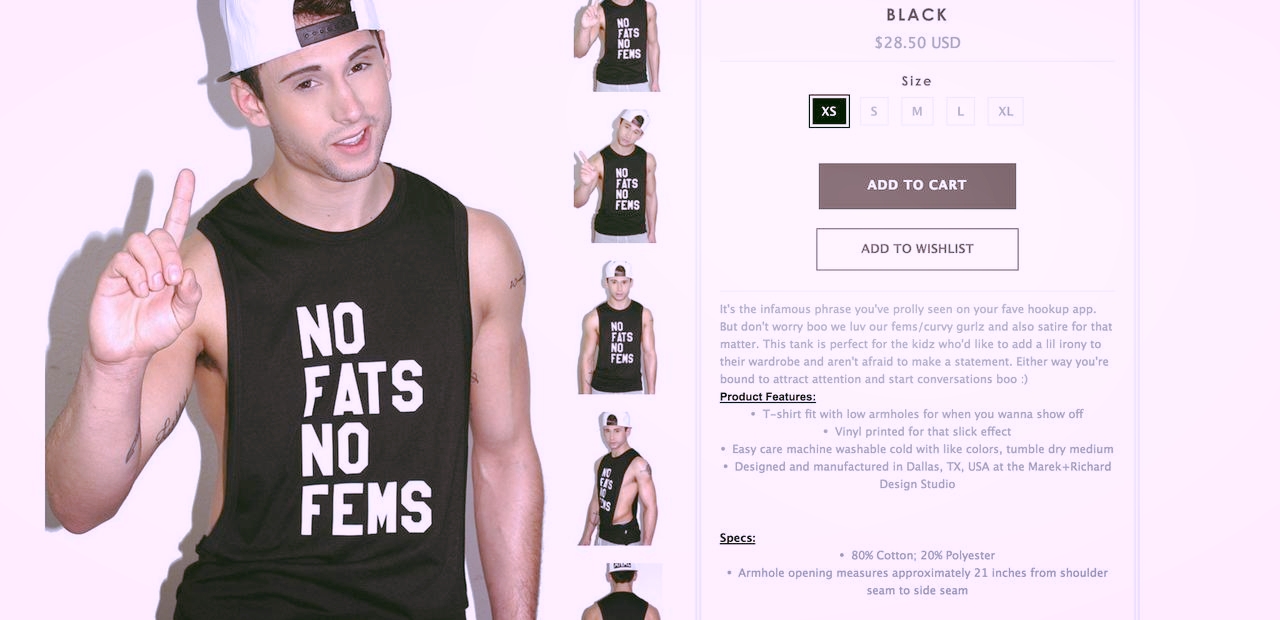 Yesterday, I saw an article about a shirt sold on a gay clothing site that proudly proclaimed NO FATS NO FEMS. Just a preference, right? My fellow queers, this is a major failure in our community. How have we become so confident and unabashed in our bigotries that we can parade such a hateful phrase proudly on our chest? We’ve allowed the shaming to go on for too long. Just a preference?