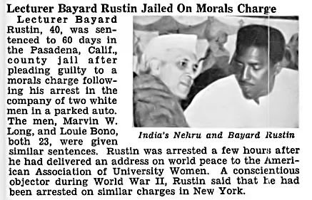 He worked as an organizer for the Congress of Racial Equality (CORE) and the Fellowship of Reconciliation (FOR) in the early 1940s, then spent two years in prison as a conscientious objector refusing to fight in the second World War. He was imprisoned again on a grueling North Carolina chain gang with other members of CORE in 1947 after testing out a Supreme Court ruling which claimed to ban segregation laws on interstate travel. He would serve a third sixty day jail term in 1953 on ‘lewd vagrancy’ and moral indecency charges after being found having sex with two men in a parked car on a warm Pasadena night.